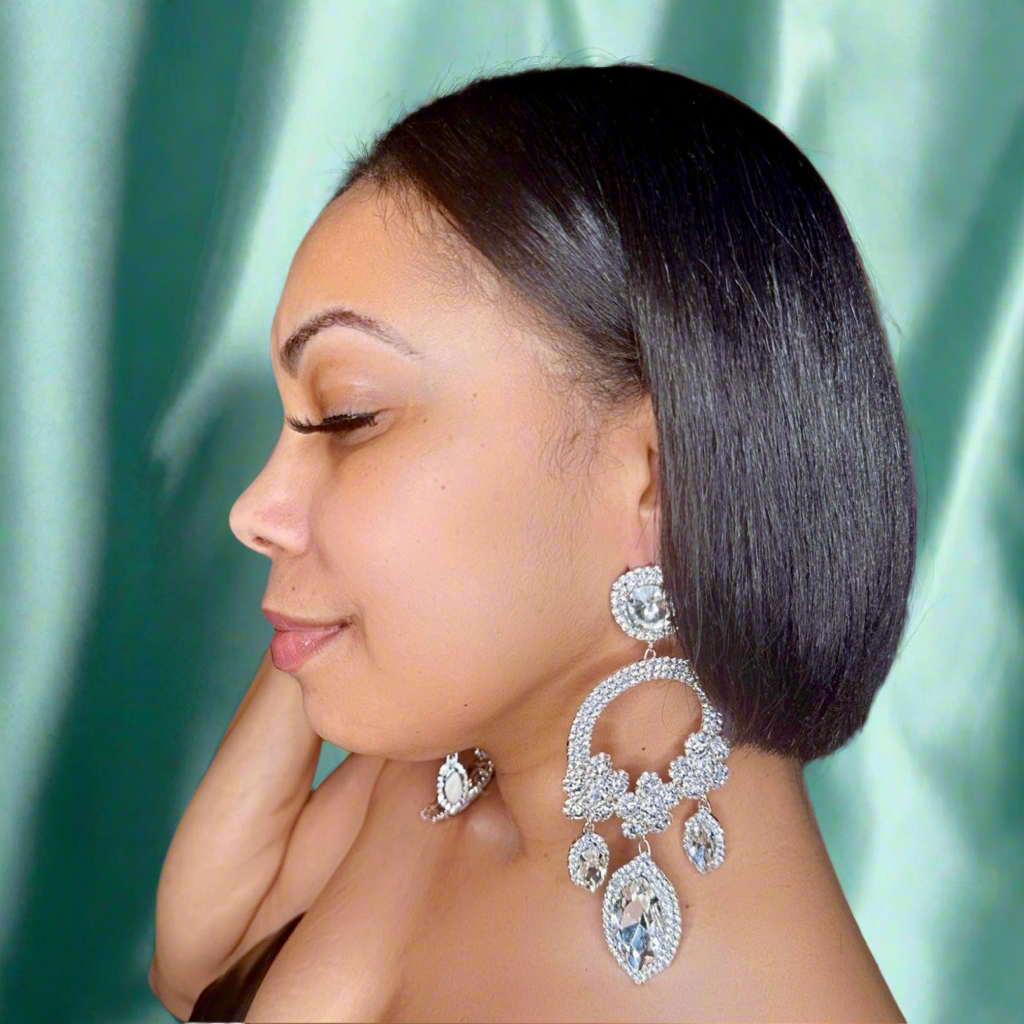 These oversized chandelier earrings feature a triple flower design paved with clear rhinestones and marquise glass stones, creating a dazzling floral and leaf motif. Measuring 2.25" by 5.25", they offer a striking statement for evening wear. The post back ensures secure and comfortable fastening, while compliance with lead and nickel safety standards provides peace of mind for sensitive skin. Perfect for adding elegant sparkle to formal occasions.
