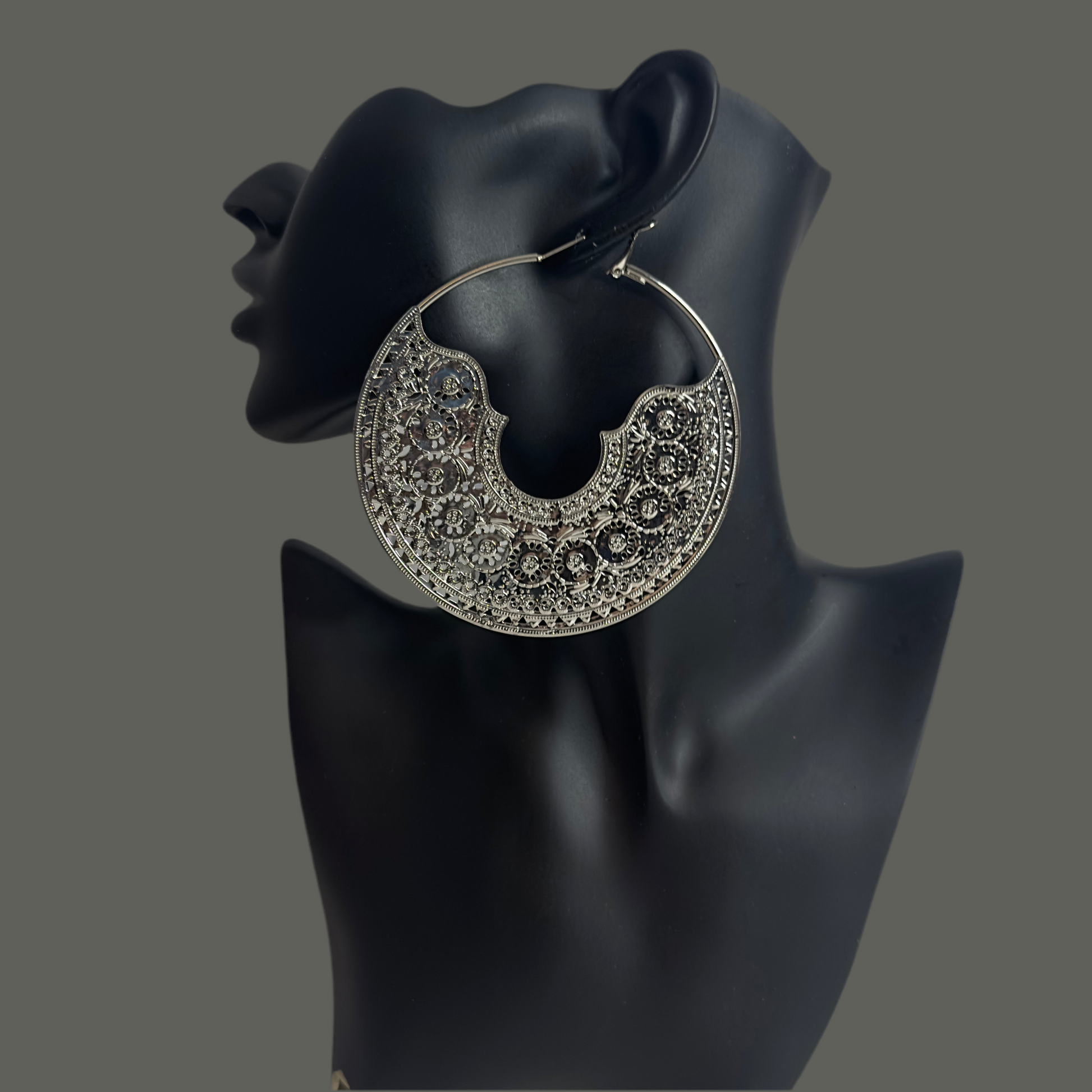 These Empress Hoops feature an oversized 3.5" x 3.5" metal filigree design, combining bold style with intricate craftsmanship. Equipped with secure omega backs, they ensure comfortable and reliable wear. Crafted to meet lead and nickel compliance standards, these earrings offer both elegance and safety for sensitive skin. Perfect for making a sophisticated statement with expert-level detail.